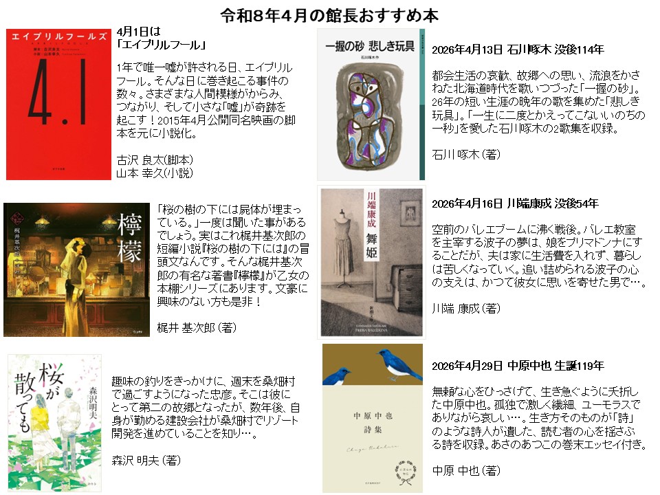 | 2026年4月1日 | 4月の館長おすすめ本 |