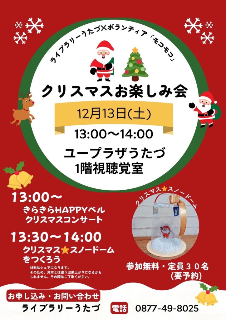 ハンドベルグループ「きらきらHAPPYベル」の子どもたちによるクリスマスに因んだ曲のハンドベル演奏に、スノードーム作りのワークショップと盛りだくさんです!