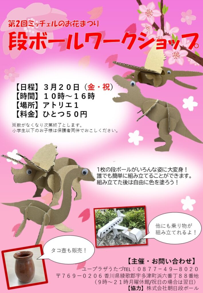 3月20日(金・祝)に第2回ミッチェルのお花まつりを開催します。ハンドメイドコーナーやおやつコーナー、ワークショップなど子供から大人まで楽しめる楽しいお店がユープラザに大集合!ハーモニーホールでは宇多津中学校&OBによる吹奏楽部演奏会も同時開催。入場無料です。ご家族お友達お誘いあわせの上是非お越しください🌸